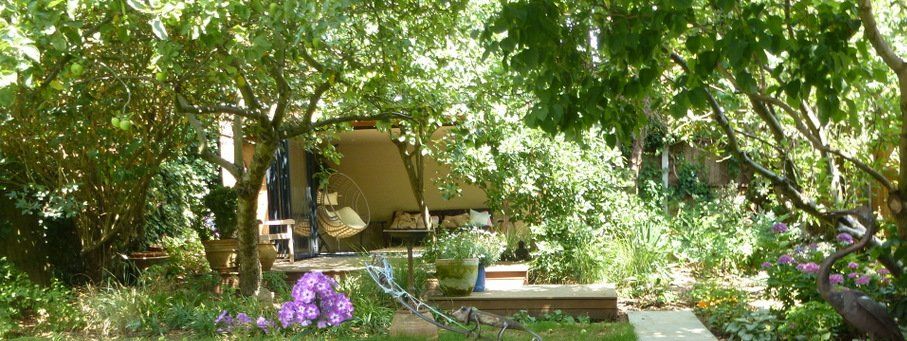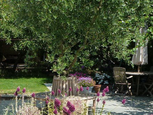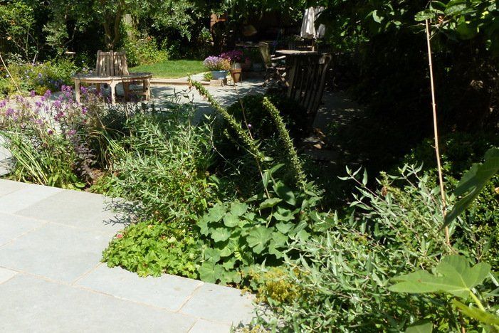 Large raised beds at the front allow for a discreet change in level and also allow for colourful sun loving plants closer to the house.
